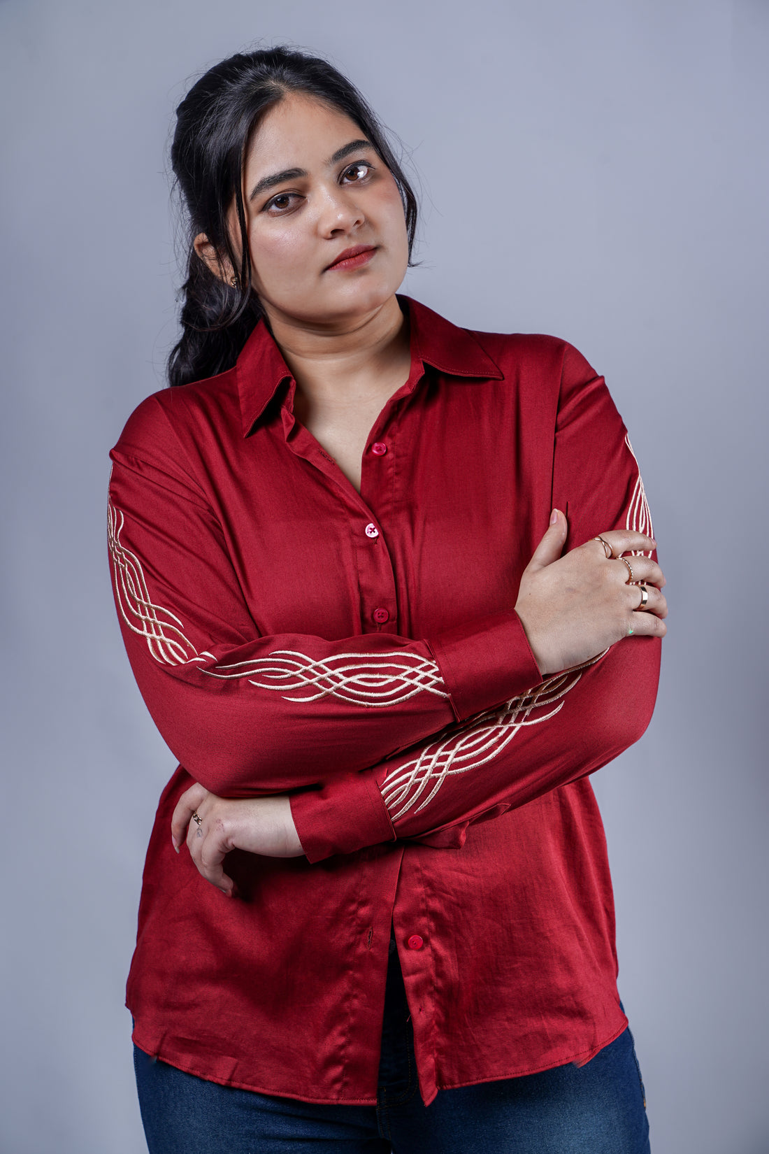 Trevae’s Rust Brown Shirt with Linear Sleeve Embroidery