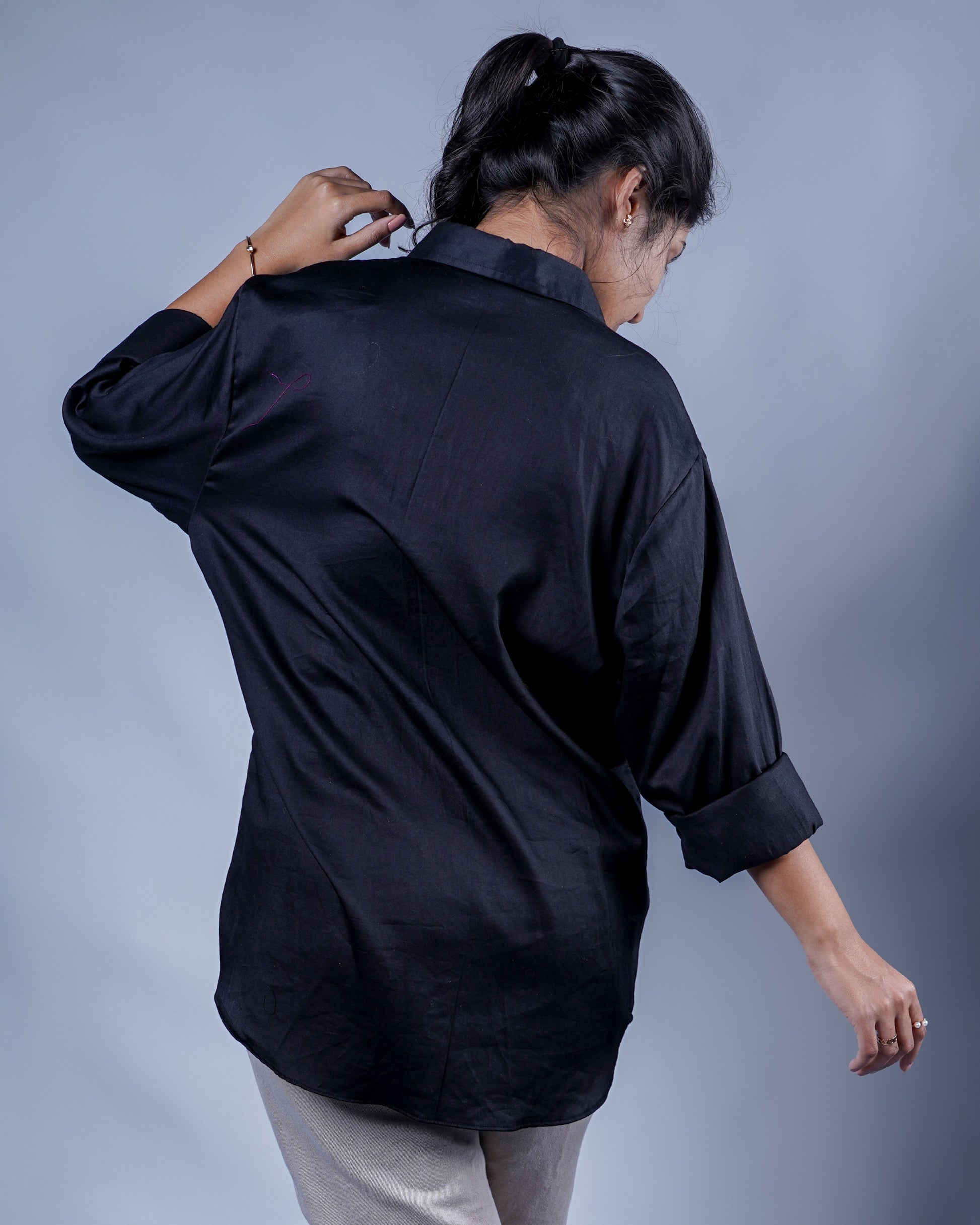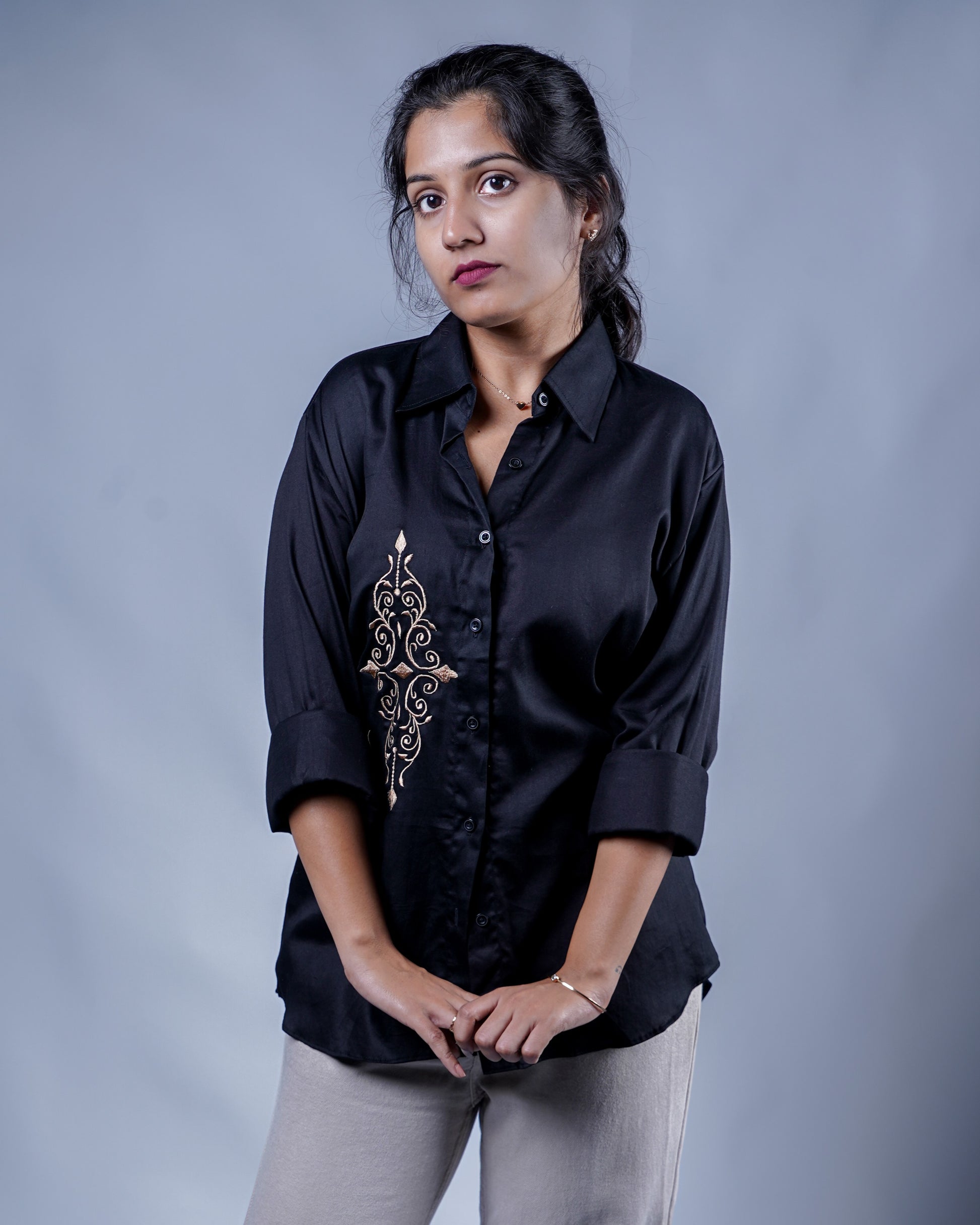 This black rayon cotton shirt is designed with a regular fit, full sleeves, and a structured front button placket. A single embroidered motif placed asymmetrically on the front adds a bold yet refined focal point, elevating the shirt without overpowering its clean form.
