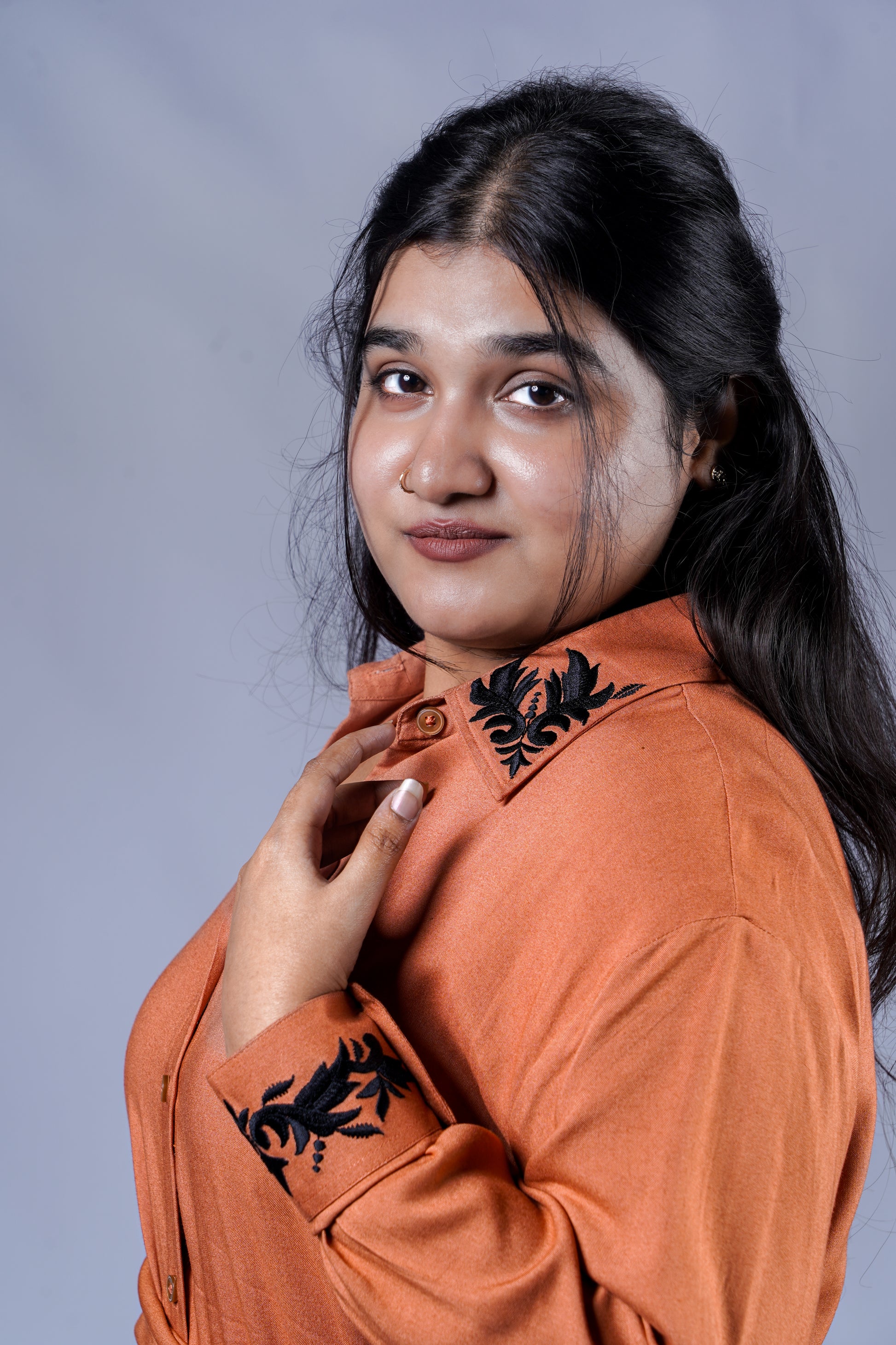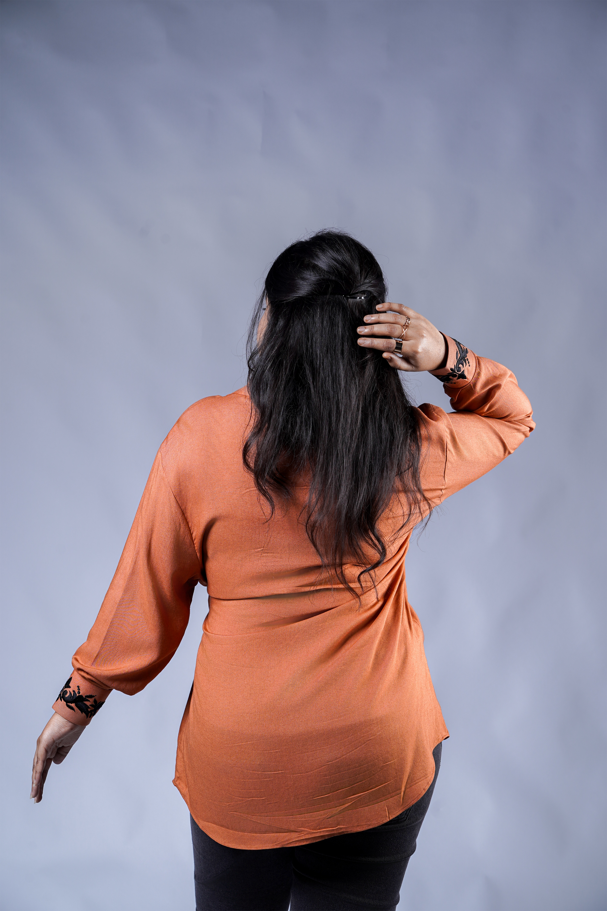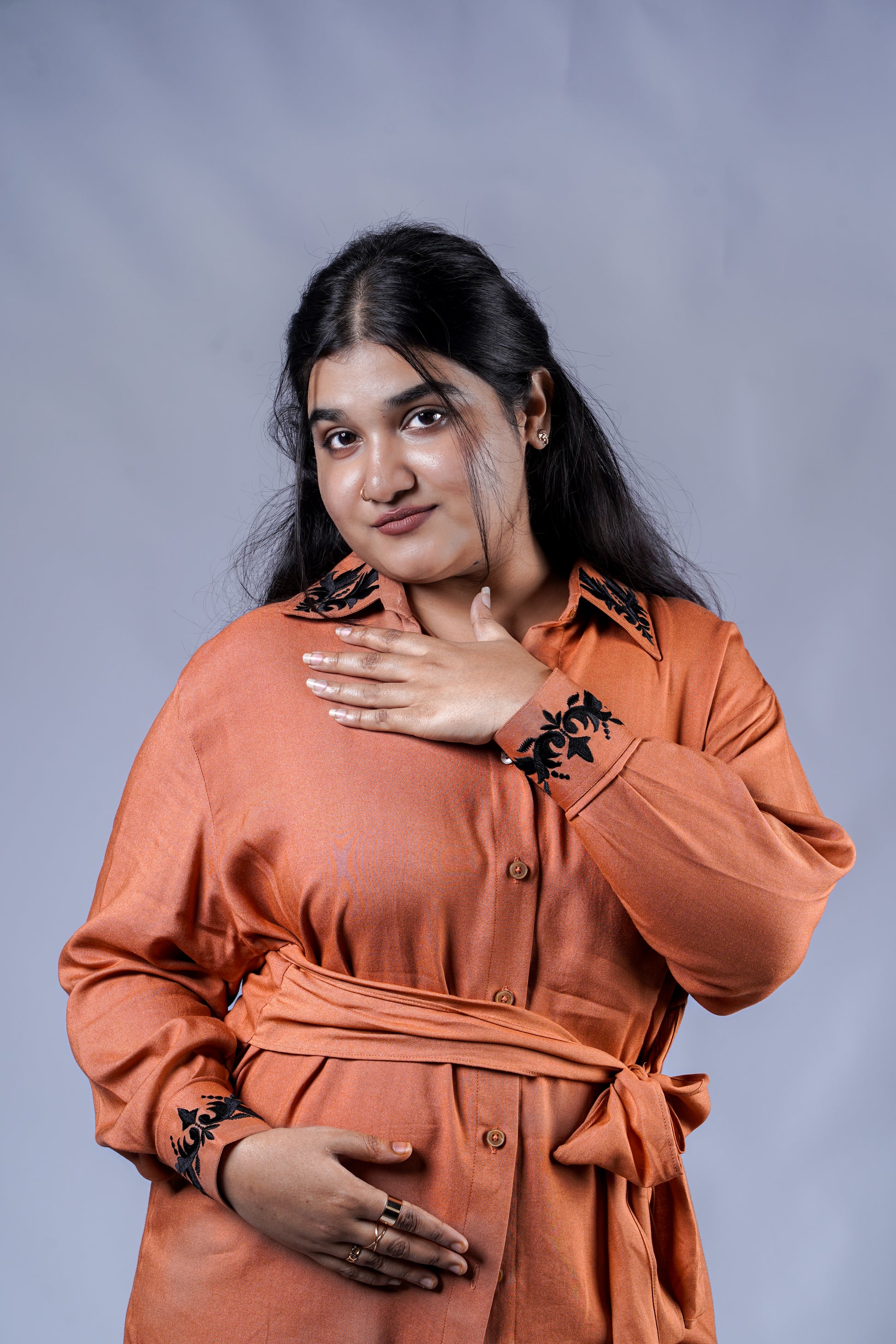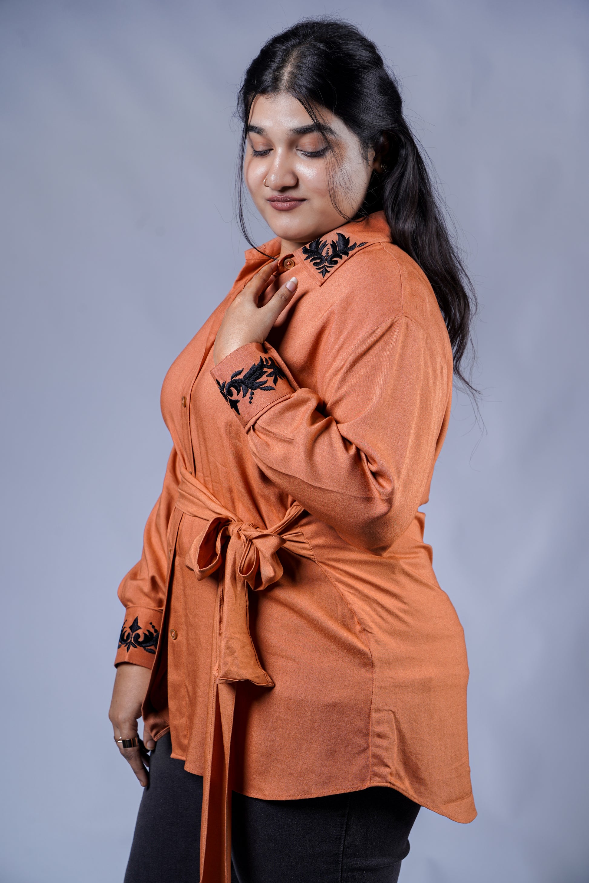 Basking in a rich brandied-melon hue, the Evening Blossom Wrap Shirt is accentuated by intricate black floral-and-foliage embroidery on both its collar and cuffs, merging botanical inspiration with refined detail. Its graceful wrap silhouette can be styled multiple ways, from a leisurely daytime ensemble to an elegantly polished evening outfit.
