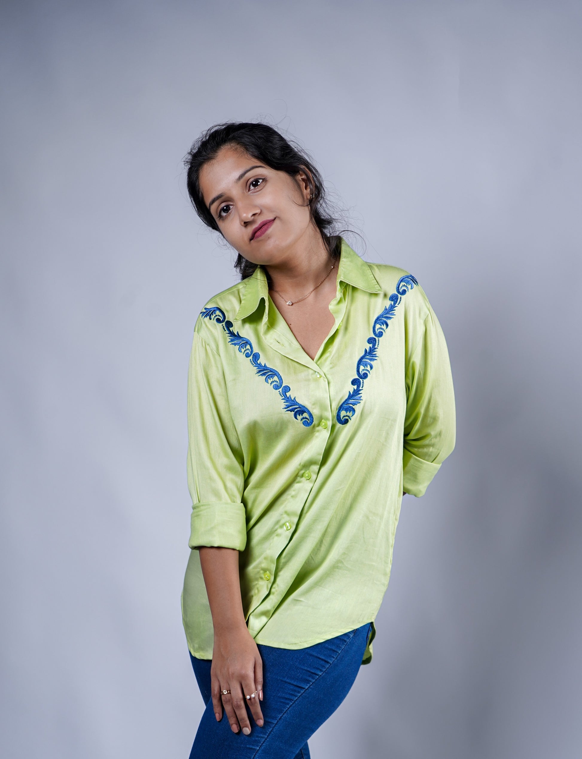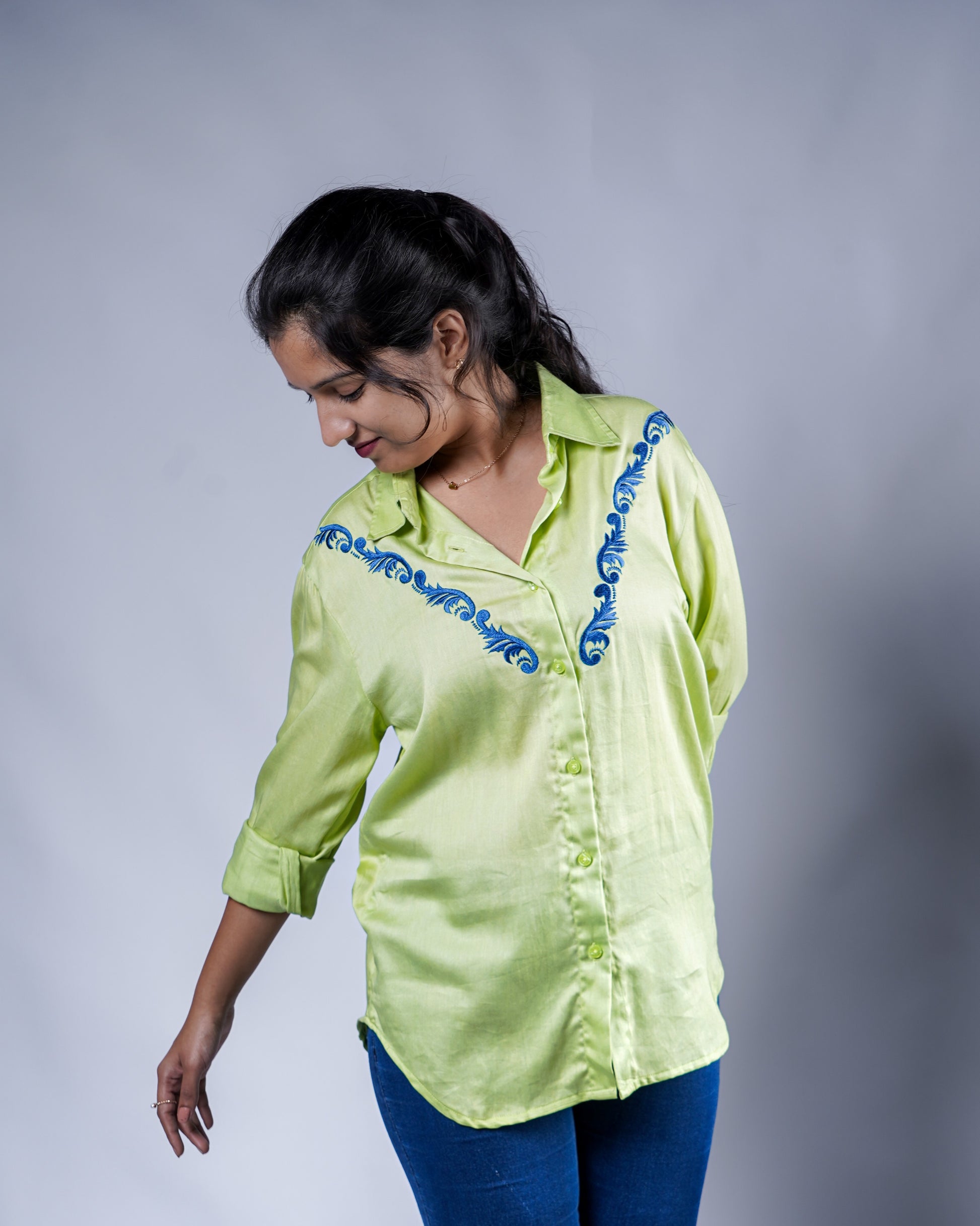 Trevae’s Lime Green Shirt with V-Shaped Front Embroidery