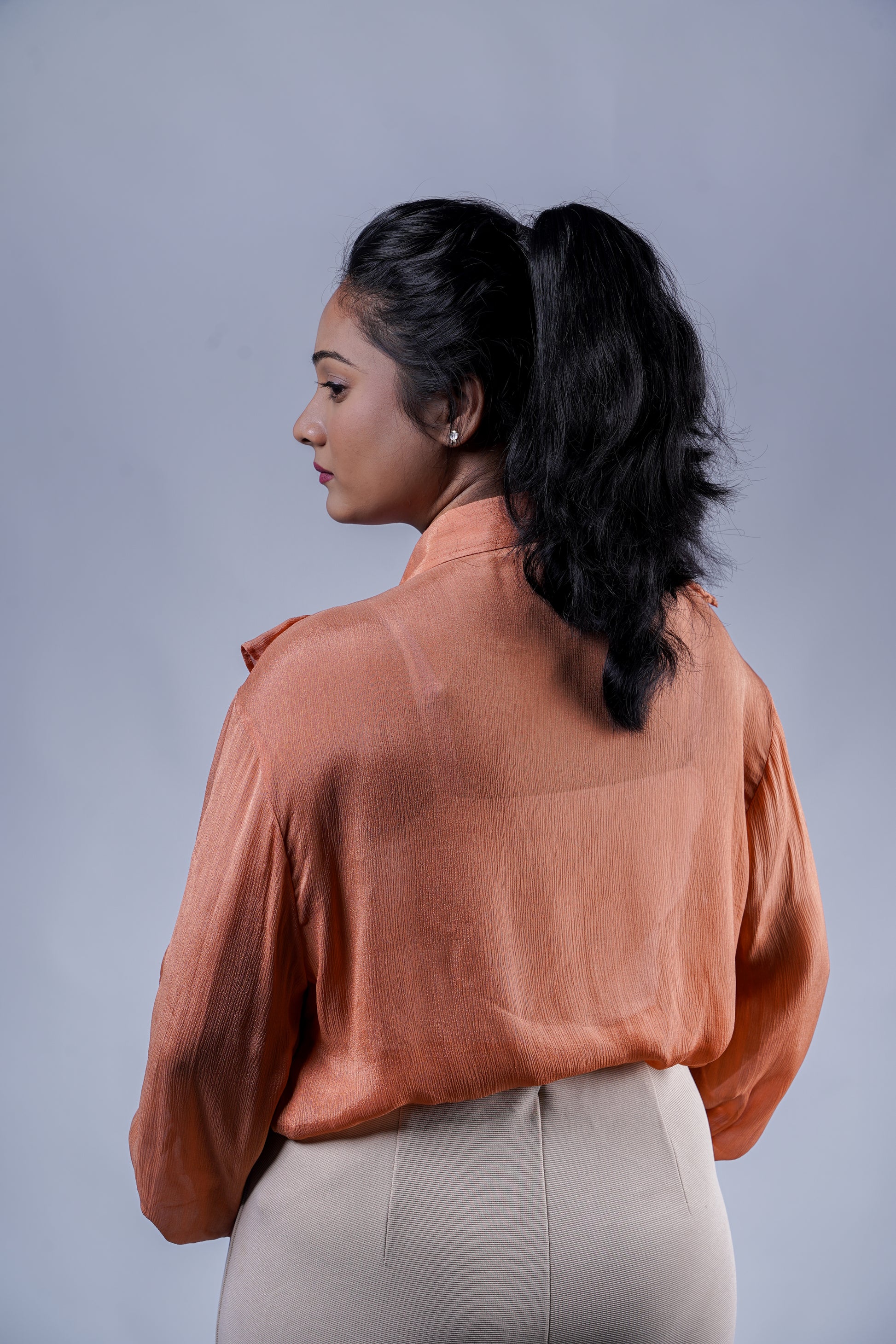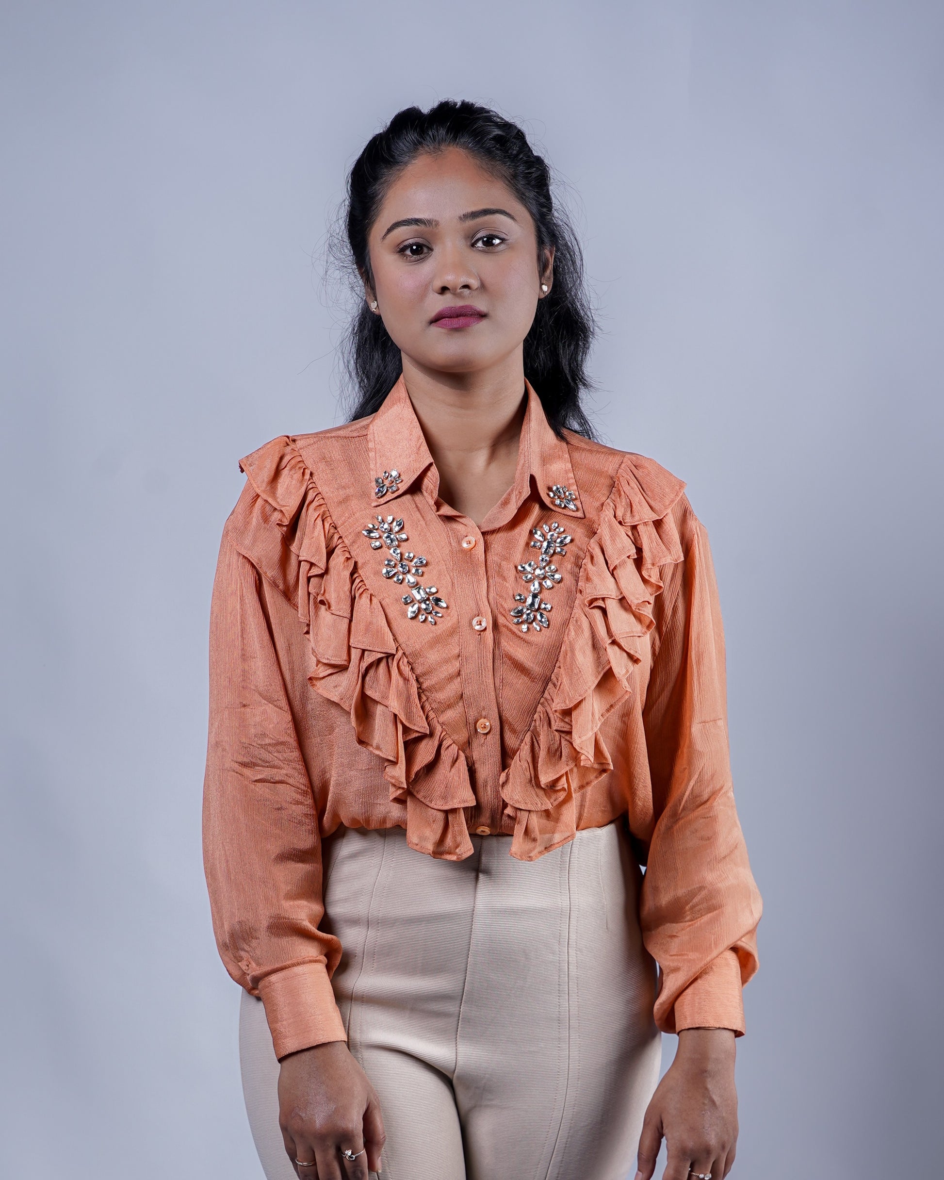 This chinnon ruffle shirt is designed with a soft full-sleeve silhouette and a clean front placket. Gentle ruffles highlight the upper body, while subtle kundan and stone work is stitched with precision near the neckline. The neutral base allows the fabric texture and craftsmanship to stand out beautifully.