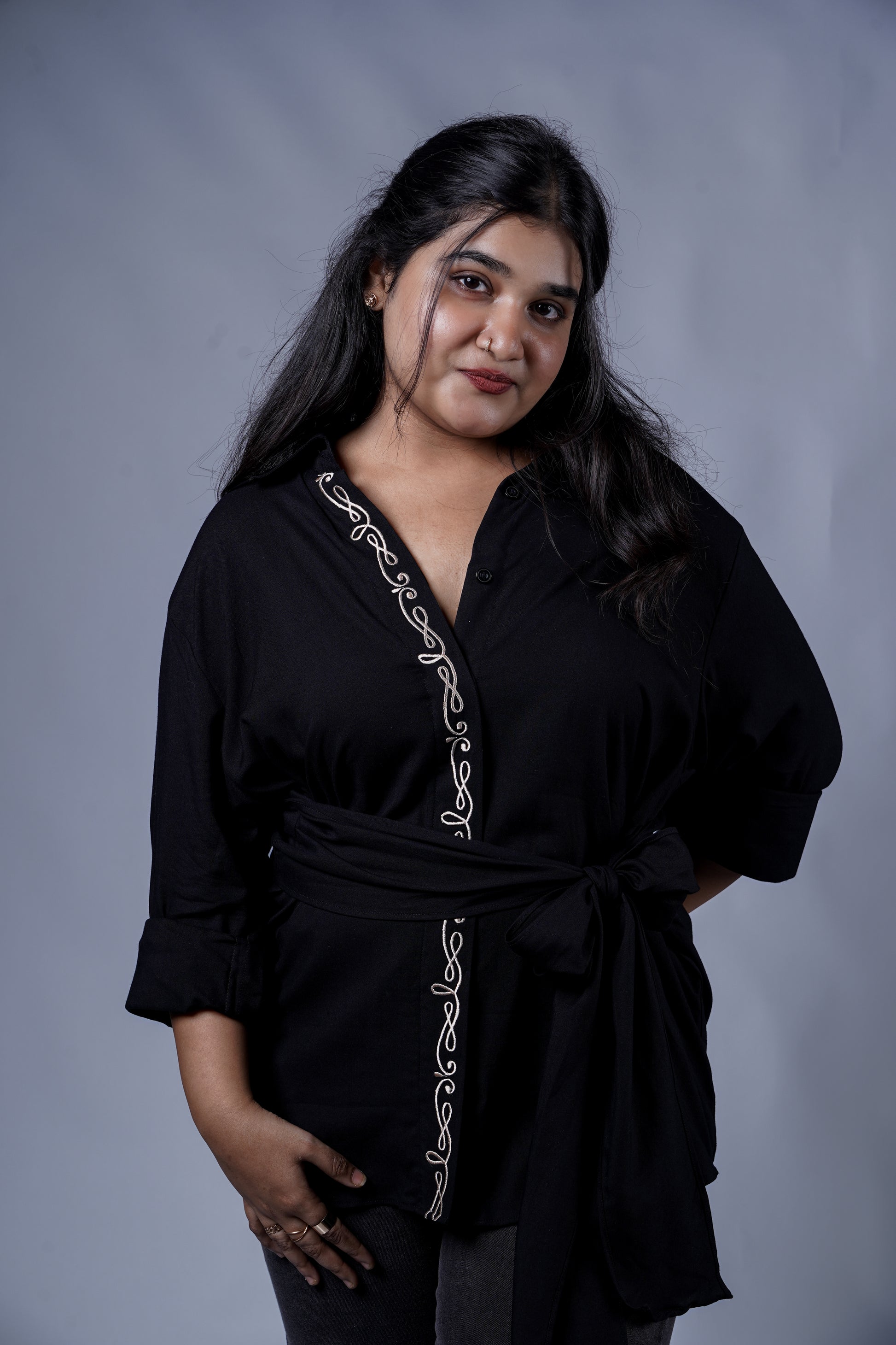Along the sleek black placket, hand-stitched beige vines reach upward like quiet tendrils under moonlight, evoking hidden beauty thriving in darkness. Each bespoke detail, from the smooth rayon drape to the precision of its wrap cinch, speaks to the confidence of the wearer. Woven as a limited-edition tale, this design embodies bold and quiet power for evening soirees and beyond.