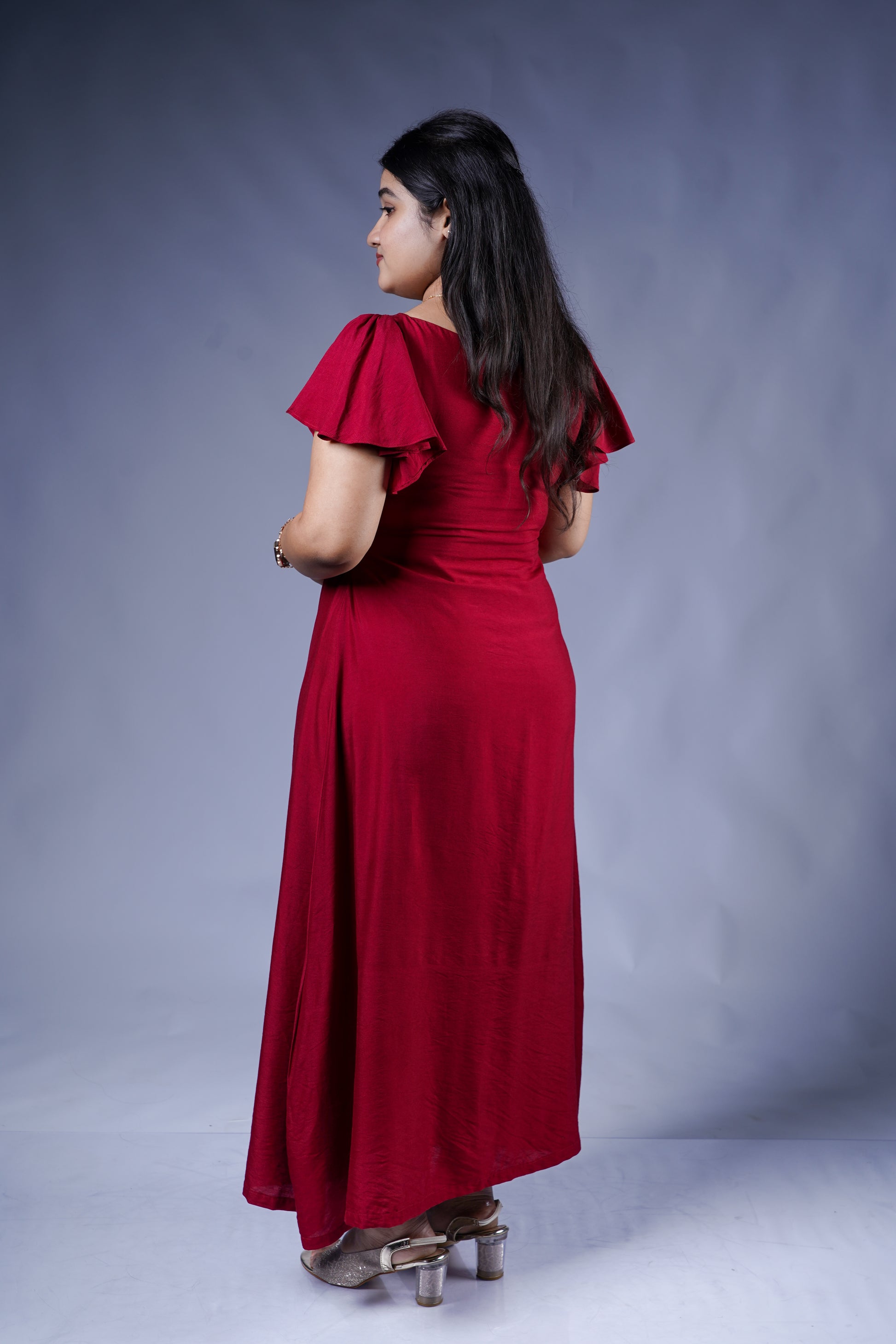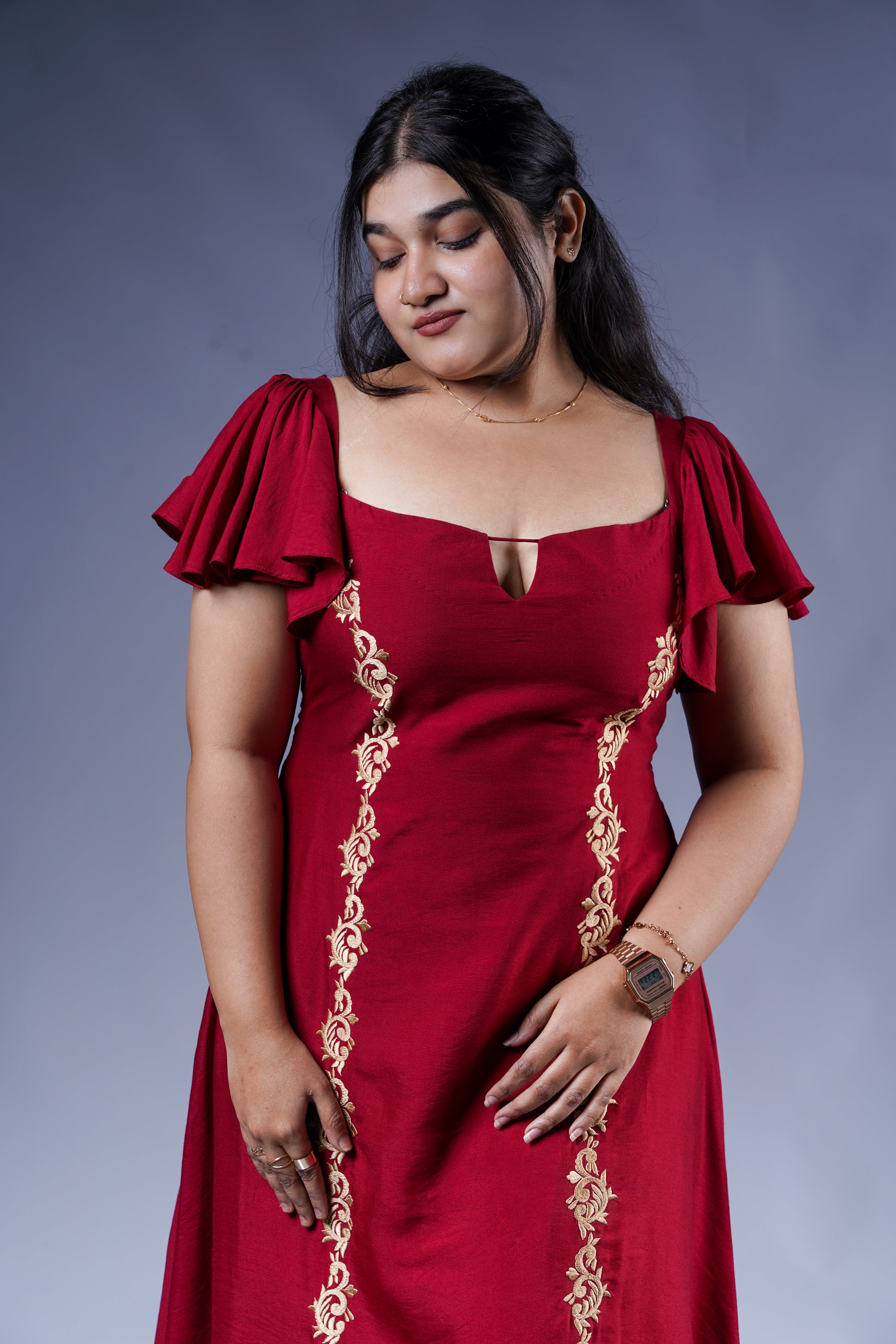 This dress is imagined from nature’s vibrant moments, the red of blooming petals touched by the evening sun. Its sweetheart neckline represents the openness of a flower unfolding, while the square back mirrors grounded symmetry. Bell sleeves sway like petals in motion. This piece celebrates bold evening energy.